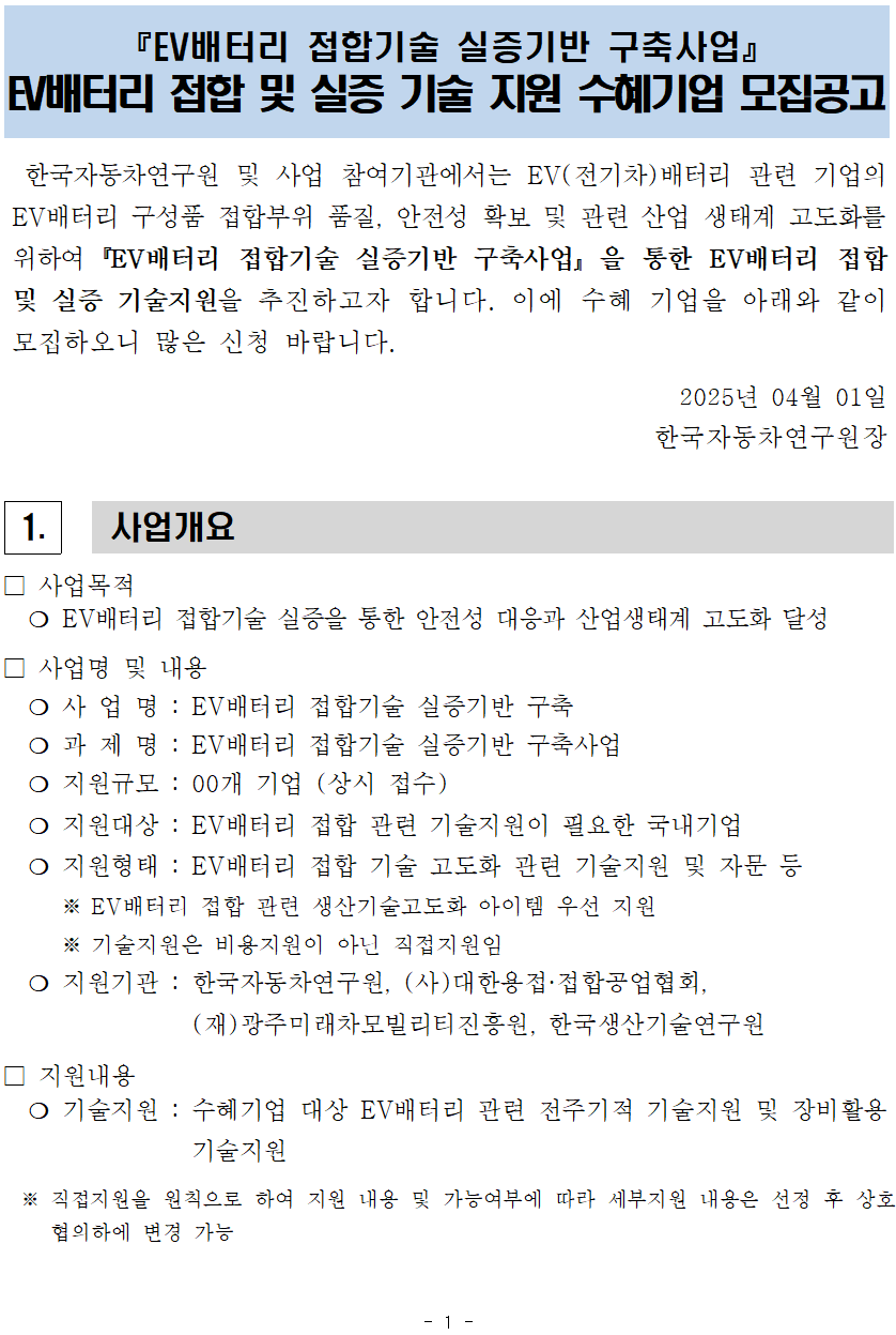 | 제목 | 『EV배터리 접합기술 실증기반 구축사업』 EV배터리 접합 및 실증 기술 지원 수혜기업 모집공고 | ||