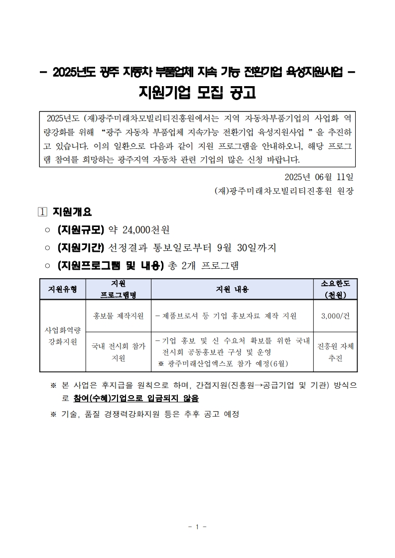 | 제목 | (마감) 『광주 자동차 부품업체 지속가능 전환기업 육성지원 사업』 2025년도 지원사업 수혜기업 모집 공고(국내전시회참가,홍보물제작 限) | ||