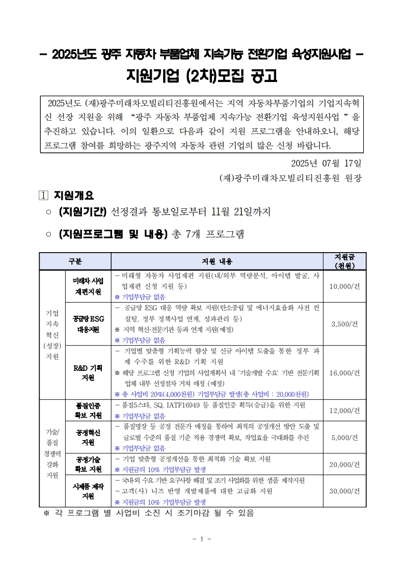 1._2025년_광주_자동차_부품업체_지속가능_전환기업_육성지원사업_지원기업_모집_공고문.pdf(0.29MB) 2._지원_신청서_및_사업계획서_양식_1부.zip(0.20MB) 3._별첨서류(양식).hwp(0.06MB) |
