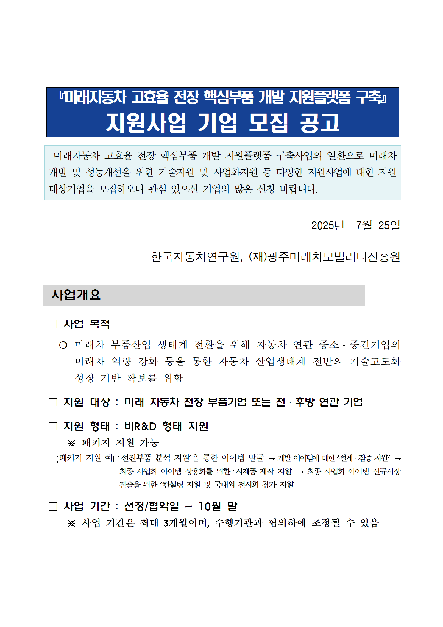 | 제목 | 『미래자동차 고효율 전장 핵심부품 개발 지원플랫폼 구축사업』 2025년도 지원사업 기업모집 공고 | ||