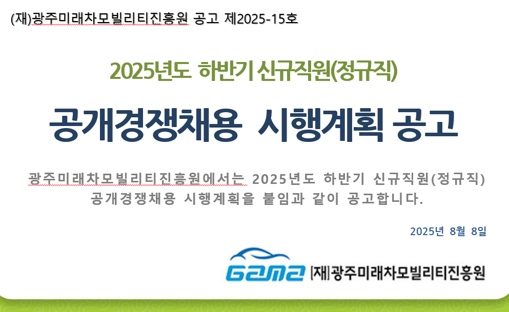 | 제목 | [제2025-15호] 2025년도 광주미래차모빌리티진흥원 하반기 신규직원(정규직) 채용시험 시행계획 공고 | ||