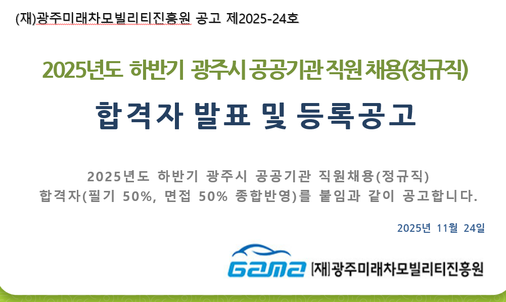 | 제목 | [제2025-24호] 2025년도 하반기 광주시 공공기관 직원 채용(정규직) 합격자 발표 및 등록 공고 | ||
