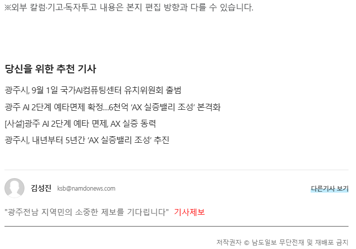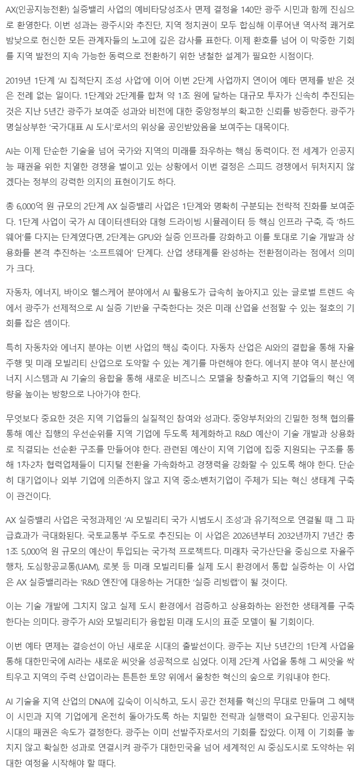 [남도일보 기고] AX 실증밸리 예타 면제, 광주 AI 혁신의 새 출발점