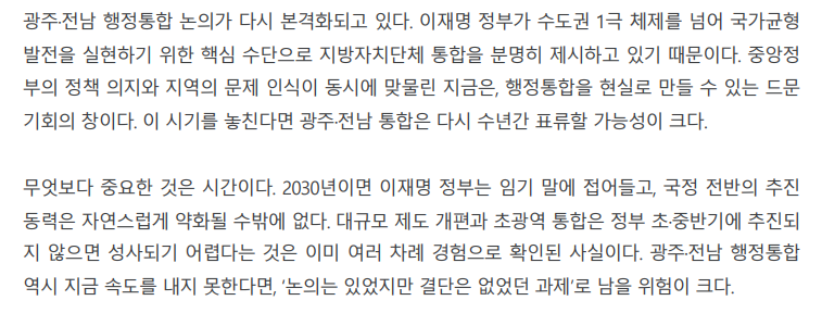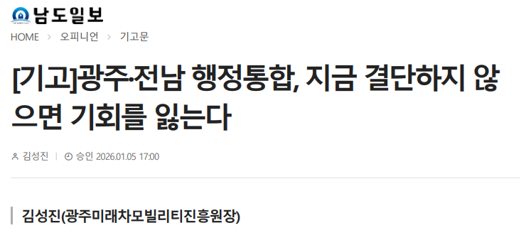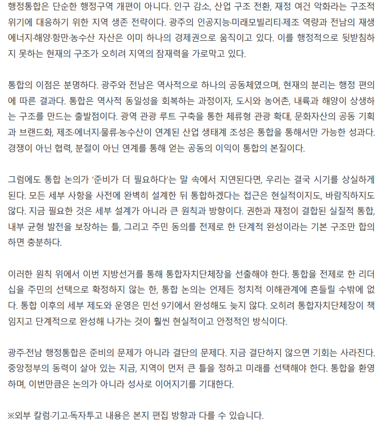 [기고]광주·전남 행정통합, 지금 결단하지 않으면 기회를 잃는다